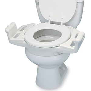 This unique toilet seat raises the existing seat height by 1" or 3" and adds low handles (3 1/2" tall) on either side to help steady a user while they sit or stand.